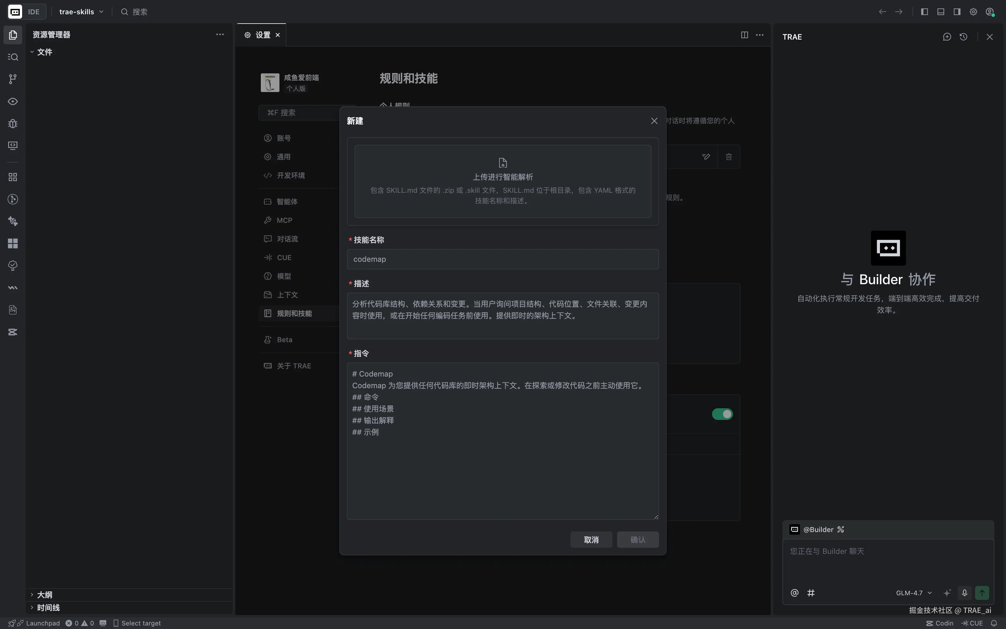 TRAE 支持在设置页面可以快速创建一个 Skill