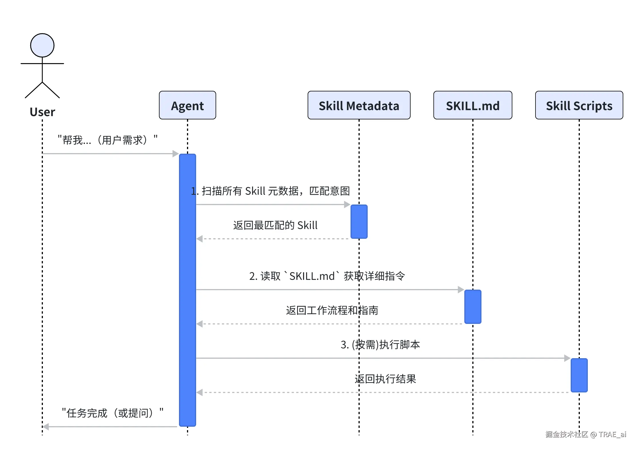 那么,Agent 是如何智能地选择并执行一个 Skill 的呢?整个过程就像一位经验丰富的助理在处理工作: