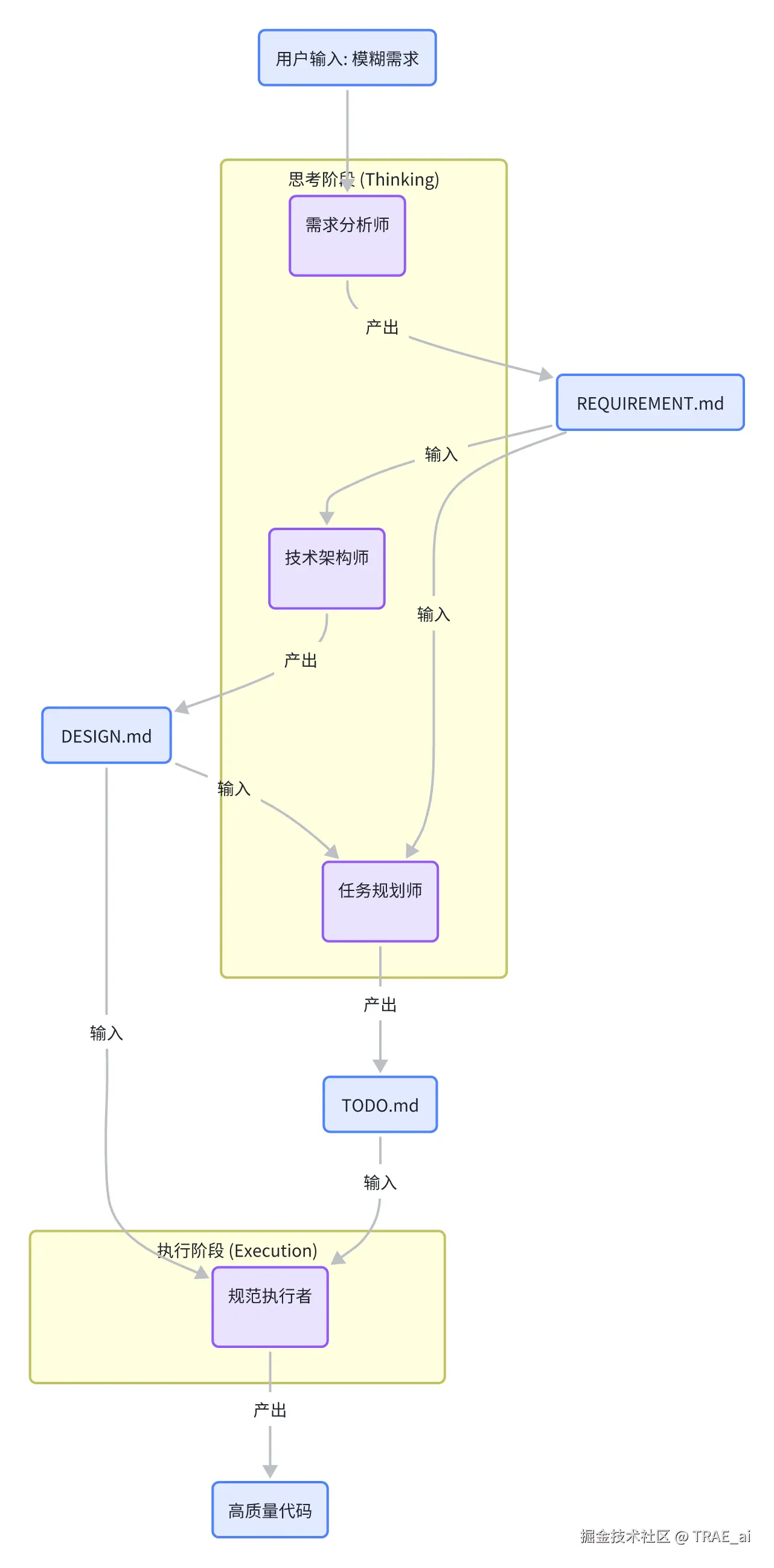 通过实现多角色 Skills 通过创建多个交付物过程文档,约束后续的编码,为编码提供足够且明确的上下文,每个Skill 专注完成一件事