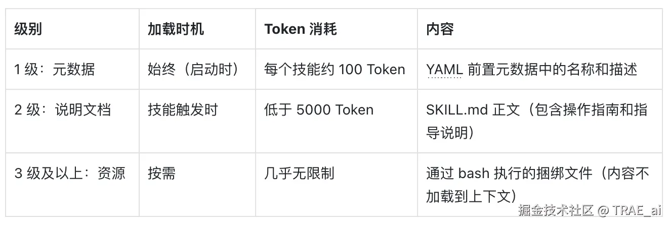 为了平衡效果和效率,Skill 设计了一套聪明的三层分级加载机制: