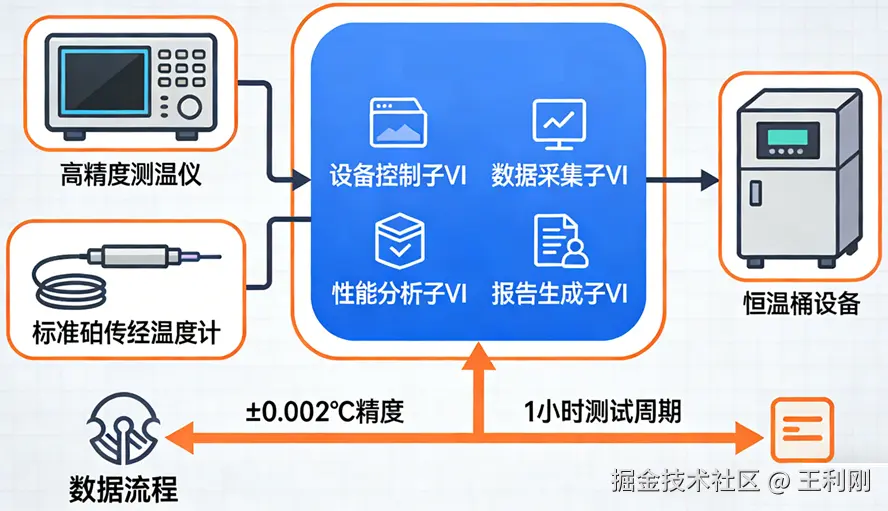 恒温槽作为计量校准、工业生产中的关键设备,其温度稳定性和均匀性直接决定测试数据可靠性。依据 JJF 1030-2010 检定规程,传统测试需人工操作标准铂电阻温度计,在温度波动性测试中需每分钟至少 6 次、持续 10 分钟读取数据,均匀性测试需覆盖 8 个点位共 64 组数据记录,存在测试周期长、人工读数误差大、数据追溯困难等问题。基于 LabVIEW 开发自动测试系统,核心需求包括:实现双通道温度数据自动采集、满足规程要求的高精度测试、数据实时记录存储、一键生成标准化报告,同时提升测试效率与数据准确性。