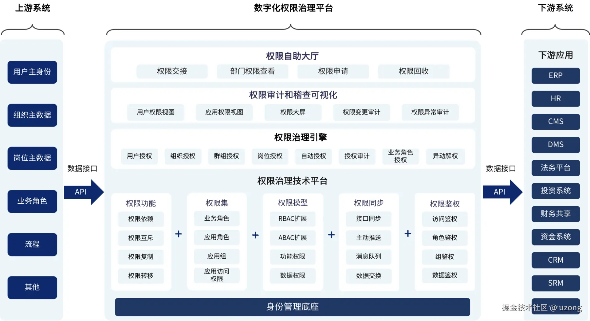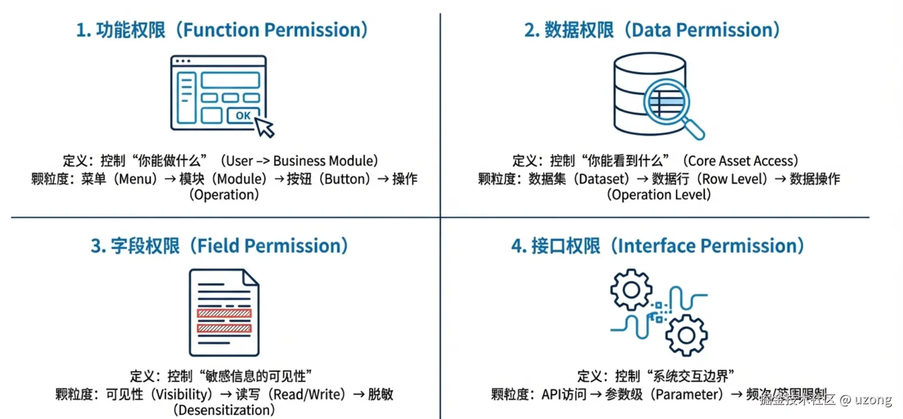 基于企业架构视⻆,拆解功能权限、数据权限、字段权限、接⼝ 权限四⼤核⼼类型,明确每种权限的定义、颗粒度、设计原则与管理模式。