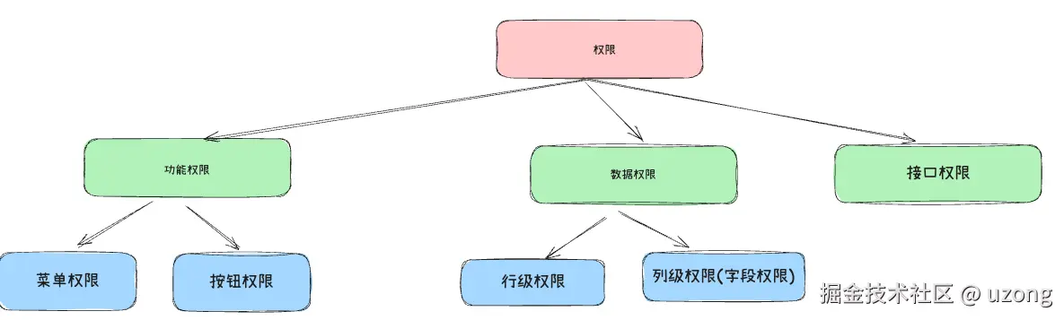 | 接口权限 | 控制后端接口的调用权限,防止越权操作,比如通过 postman 直接访问接口。例如:只有管理员才能调用 /api/deleteUser |