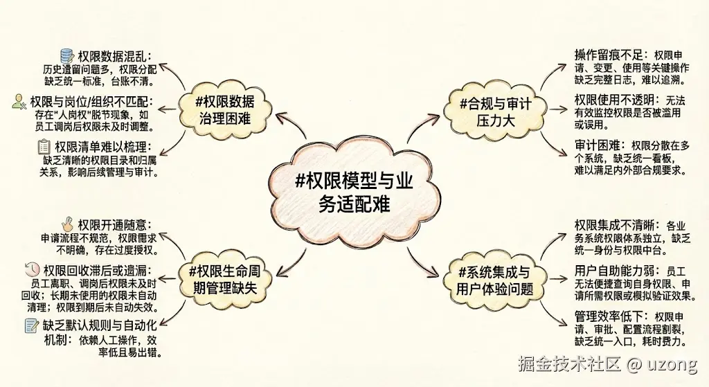 具体可归结为:适配难、数据乱、回收慢、留痕弱、审计难、集成散。因此,需要从统一权限模型、建立权限台账...等方向系统性推进