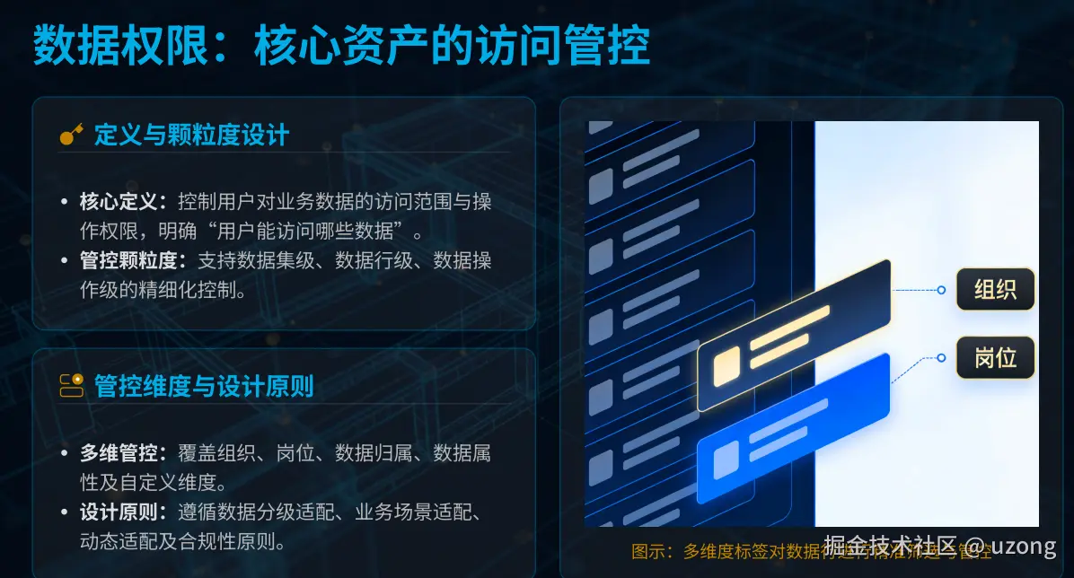 数据权限是权限体系的核心层,通过精细化控制用户可访问的数据范围,确保“仅看所需”,有效防范核心数据泄露或篡改,保障数据安全、完整性与可用性。