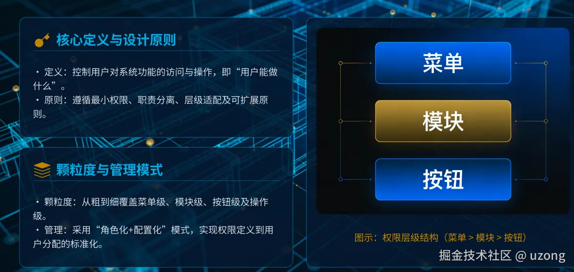 度,避免过粗导致权限滥⽤、过细增加管理成本。可以进一步细分:菜单、模块、按钮、操作。