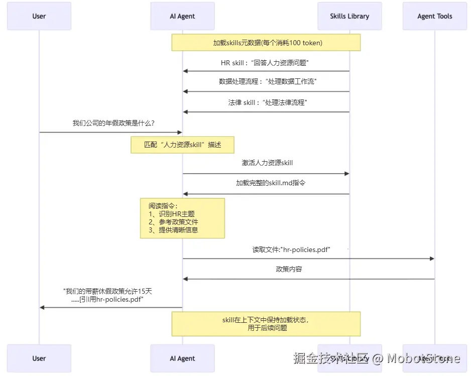 - 发现阶段: 启动时,智能体只加载每个技能的名称和简介。信息够用来判断“这个技能可能用得上吗?”