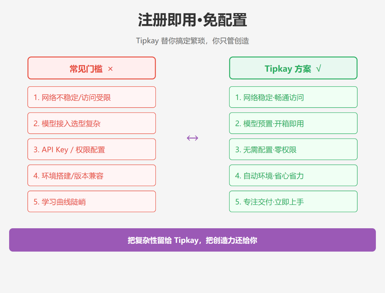 Tipkay 的产品取向是把复杂性收敛在平台侧:你进去就能开工,把注意力留给“我要交付什么结果”。