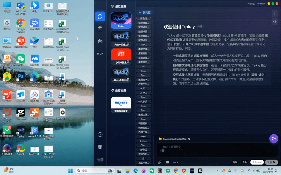 Tipkay 的设计不是做一个“更会聊”的桌面 AI,而是做一个能把事情跑完的超强智能体平台: