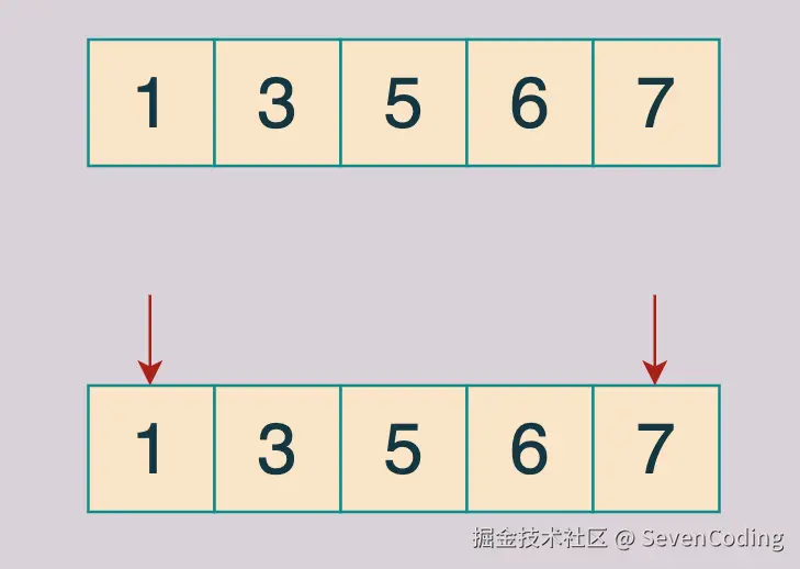 这道题需要奇数在⼀半,偶数在另外⼀半就可以,并没有要求他们之间的顺序,那么就可以⽤双指针,⼀个指针在左边,⼀个指针在右边,⽐如 1,3,5,6,7 :