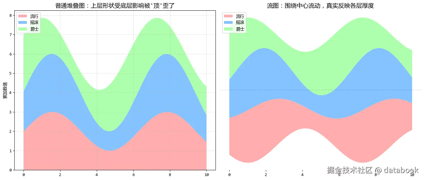 流图解决了一个视觉错觉问题:在普通堆叠面积图中,上面的数据层会因为下面数据层的起伏而被迫“扭曲”,很难看出它原本的形状。