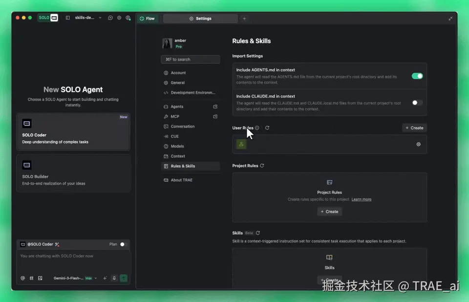 今天我们全面更新了 Skills 的功能,我们不仅在 Beta 版的基础上新增了 2 个功能,同时在 SOLO + IDE 模式以及全部智能体和模型(含自定义)均支持了 Skills!