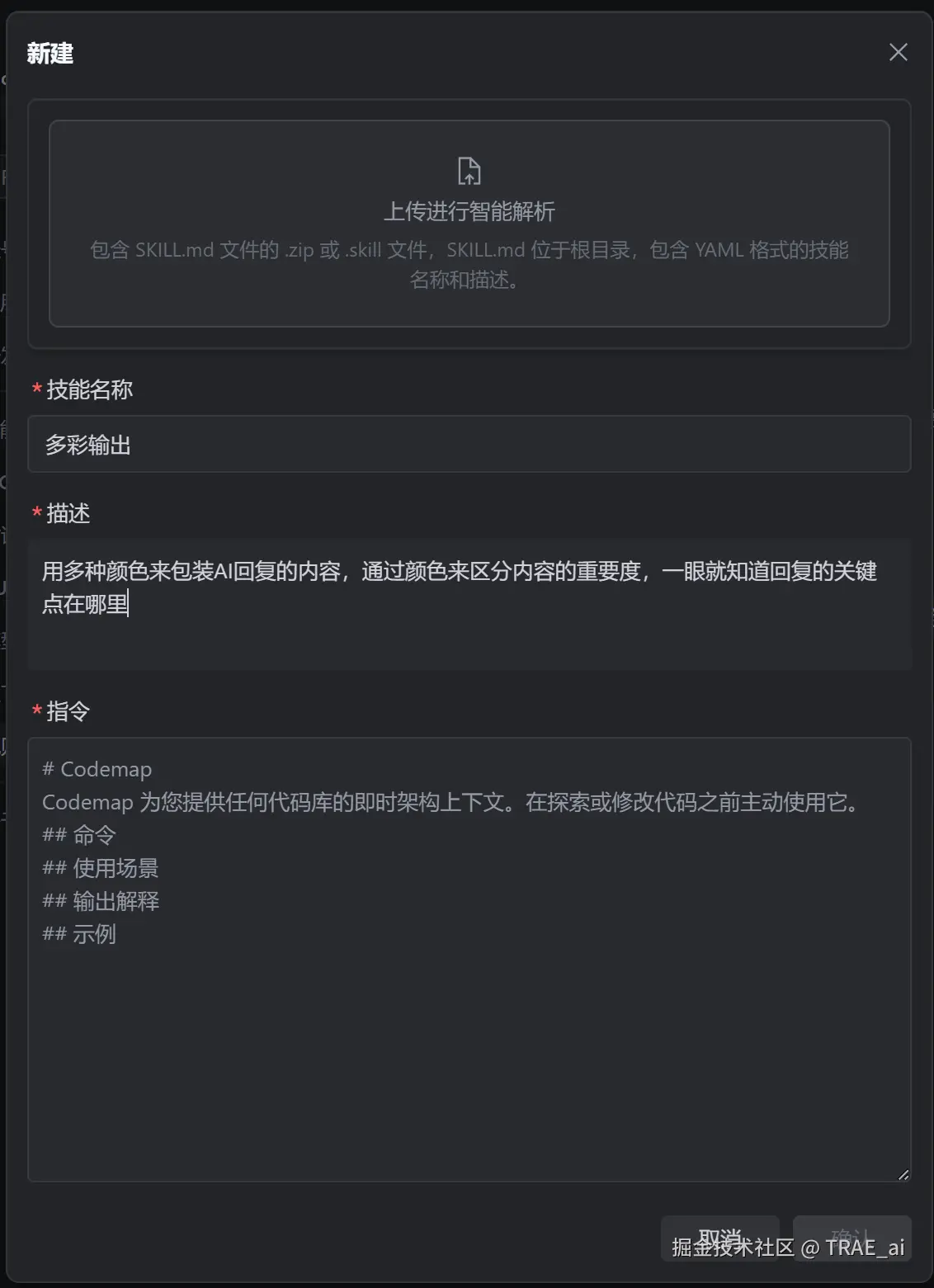 最简单的方式是直接和 TRAE 对话。描述你的需求,AI 会帮你生成 Skill。