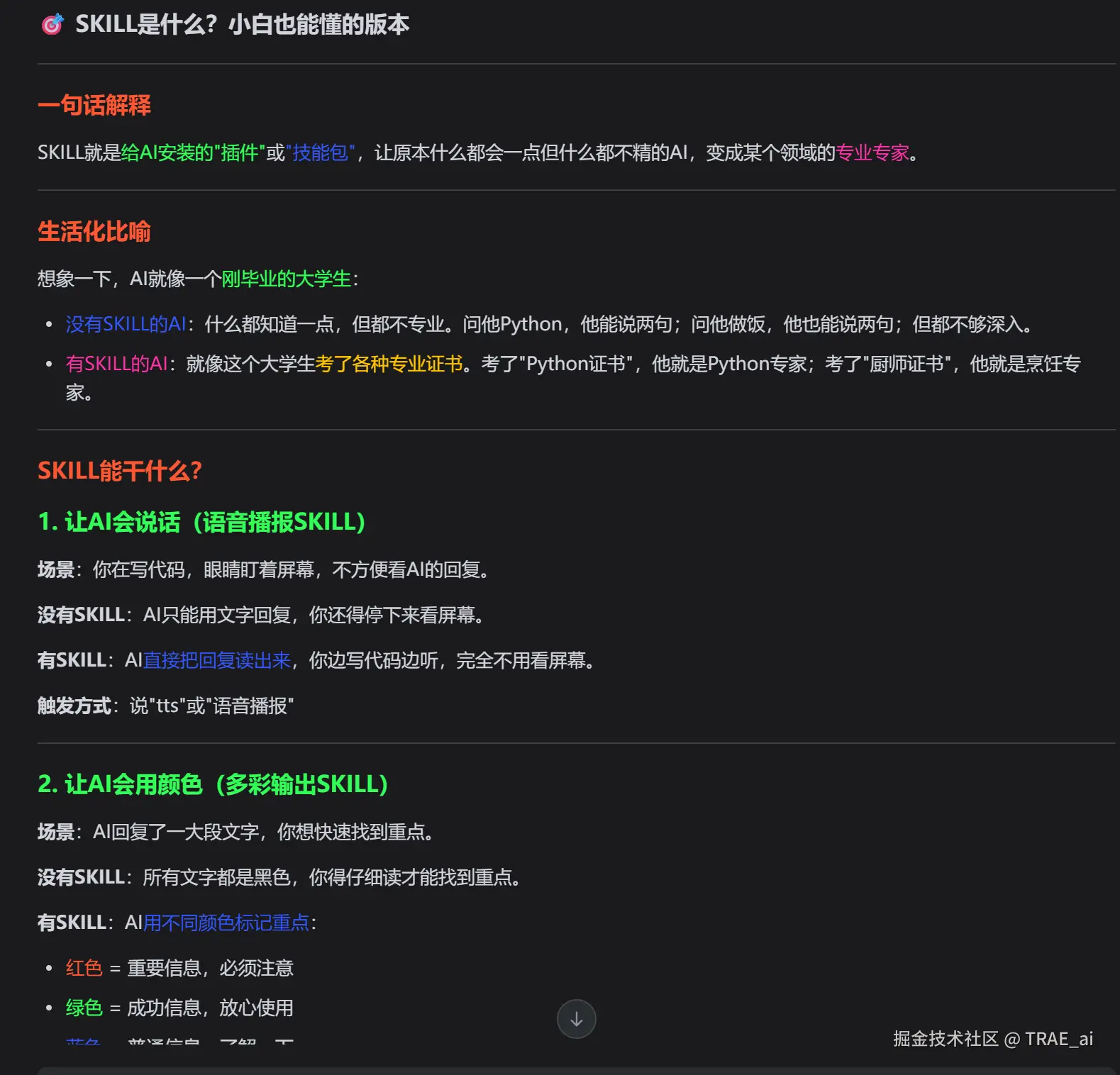 技能会根据内容的类型和重要度,自动为不同部分添加颜色: