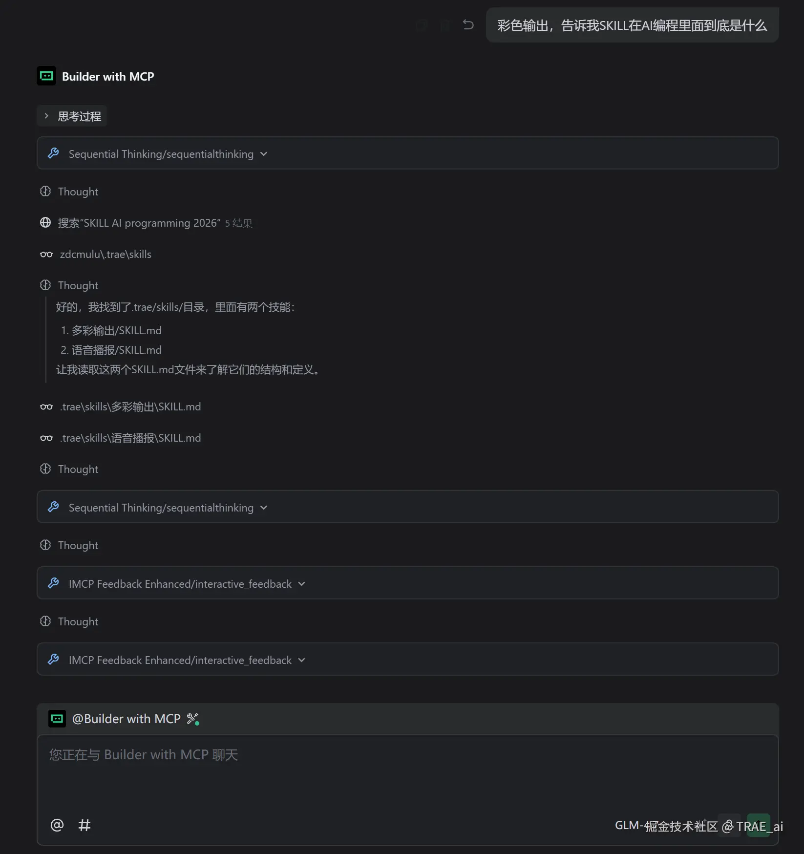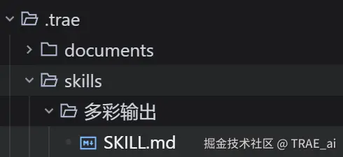 创建完成后,我们回到文件目录。你会发现在根目录下的 .trae 文件夹里,系统自动创建了一个 skills 目录,并在其中生成了一个名为“多彩输出”的子目录。这个子目录里包含一个SKILL.md 文件。这个文件的内容,正是由我们刚刚填写的技能名称、描述和指令生成的。
