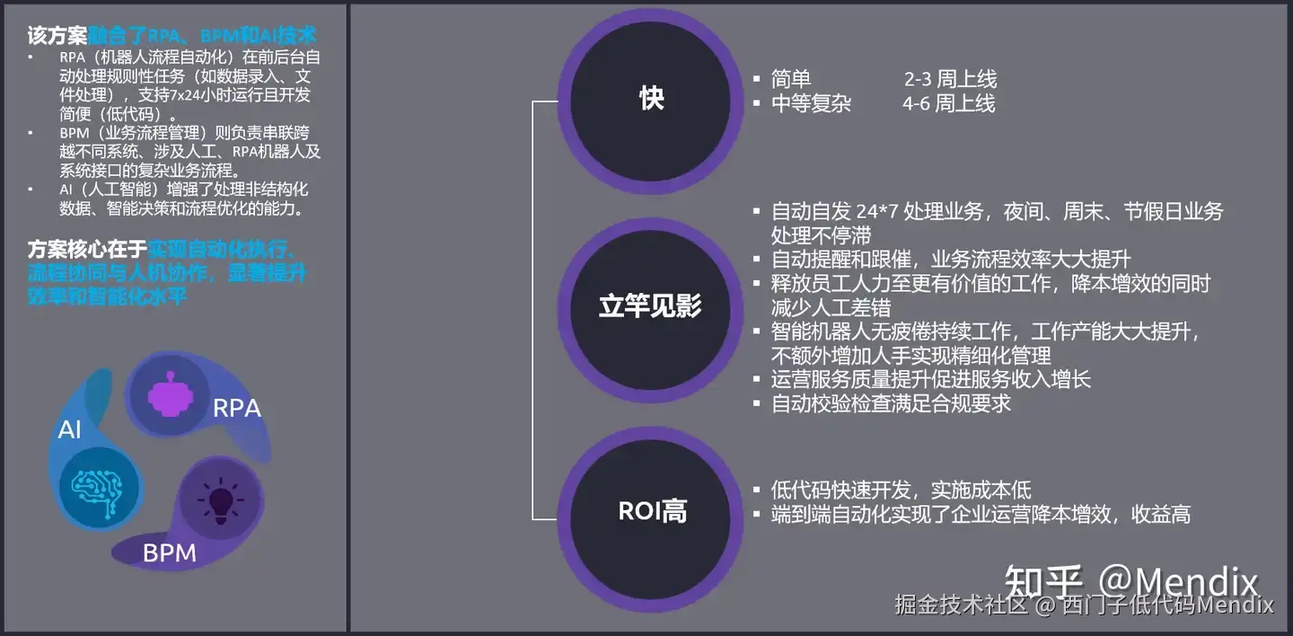 该方案基于Mendix实现了BPM的业务流程全面贯通,通过Mendix BPM 与RPA 和AI的融合,已经为客户在营销、财务、人力资源、客服等多个领域实施了高ROI的端到端业务流程自动化。