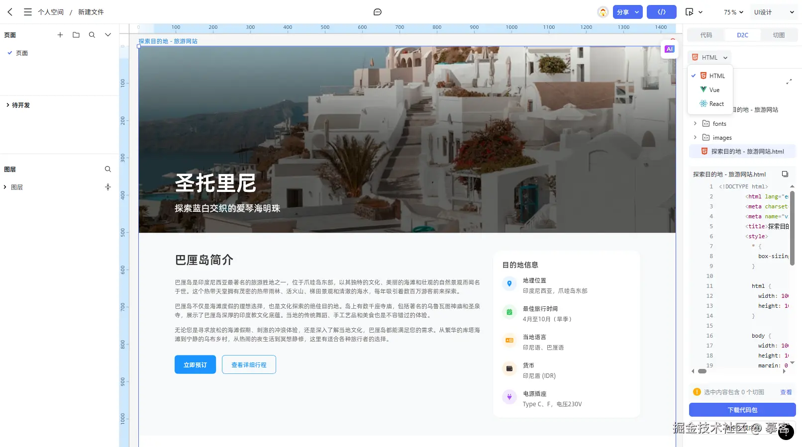 3)D2C方面,摹客3支持将设计稿自动转化为HTML、React或Vue代码。生成后的代码,将以工程项目结构方式呈现,可以一键下载代码包,或复制到开发工具内。