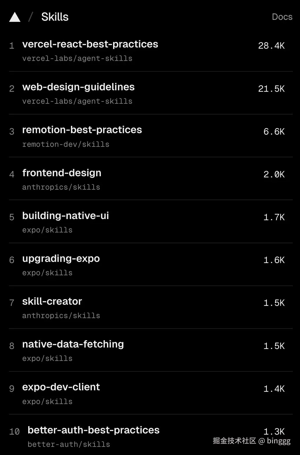 Vercel 推出了 skills 命令来快速安装 Skills 到各个工具中,这是当前热门的 skills 列表。