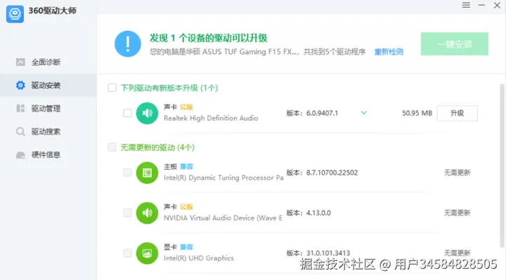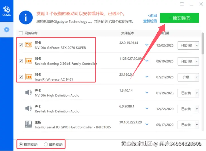 扫描完成后,选择稳定驱动或者最新驱动,并勾选上需要更新的硬件驱动,点击一键安装即可。