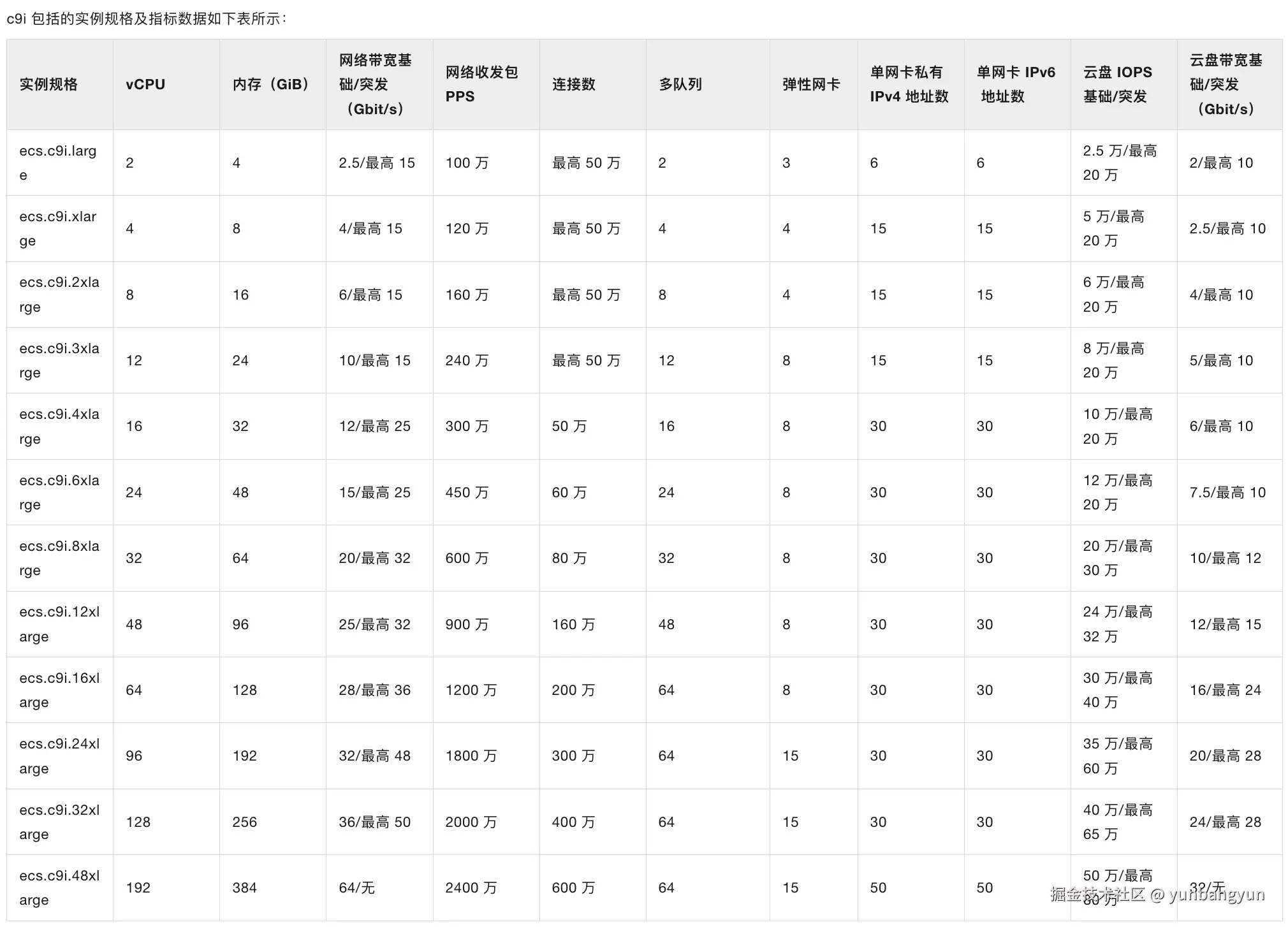 云服务器ECS计算型c9i实例的CPU内存配置不同,对应的网络带宽、网络收发包PPS、连接数、多队列、云盘IOPS等性能参数也不同,详细如下表: