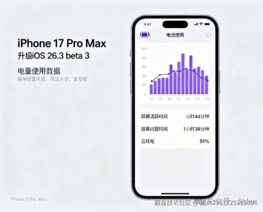 一位iPhone 17 Pro Max用户提供的数据显示,在升级到iOS 26.3 beta 3后,他的设备屏幕活跃时间为5小时44分钟,屏幕闲置时间1小时38分钟,耗电51%。