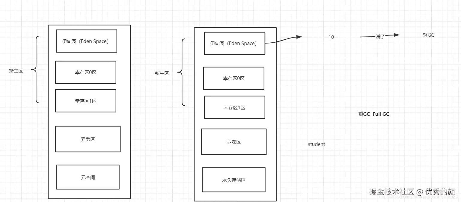 伊甸园满了就触发轻GC,经过轻GC存活下来的就到了幸存者区,幸存者区满之后意味着新生区也满了,则触发重GC,经过重GC之后存活下来的就到了养老区。