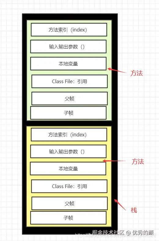 栈帧:栈底部子帧指向上一个栈的方法 上一个栈的父帧指向栈底部方法