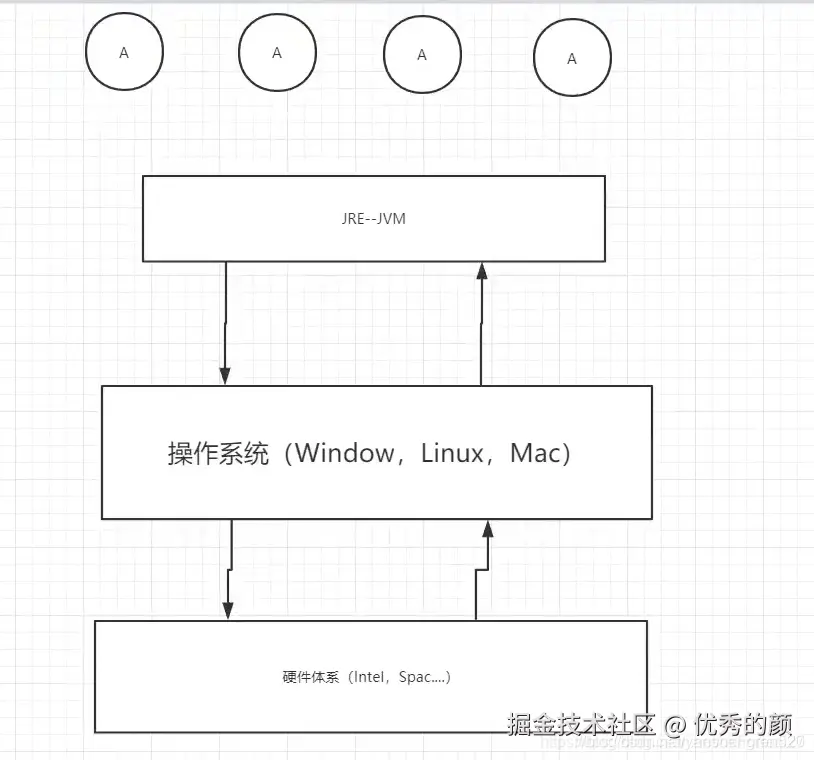 操作系统上,安装JVM,所有的Java程序(A1、A2、A3)在上面运行。