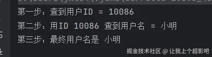 System.out.println("第二步:用ID " + userId + " 查到用户名 = 小明");
