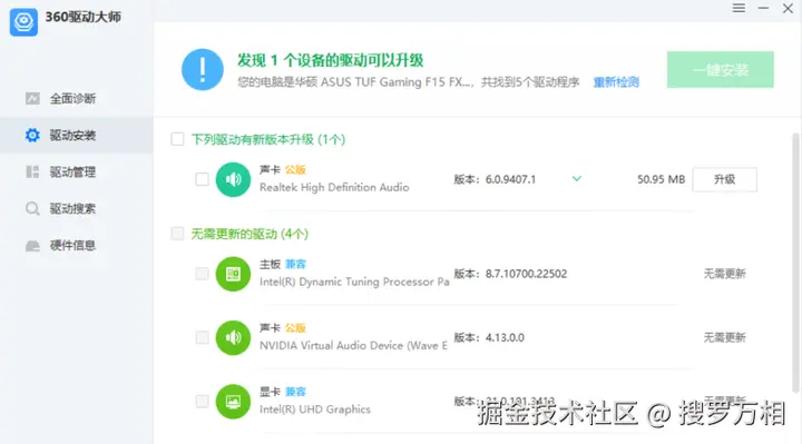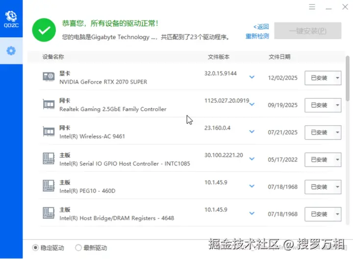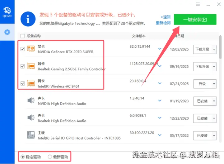 扫描完成后,选择稳定驱动或者最新驱动,并勾选上需要更新的硬件驱动,点击一键安装即可。