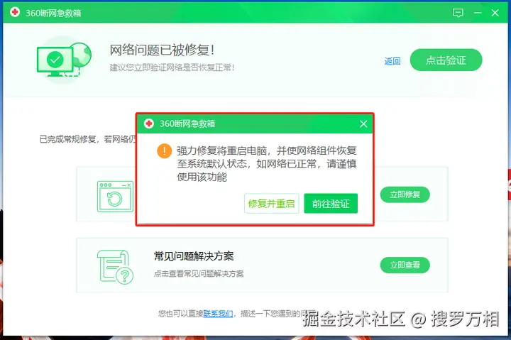 强力修复会重启电脑,重置网络配置: