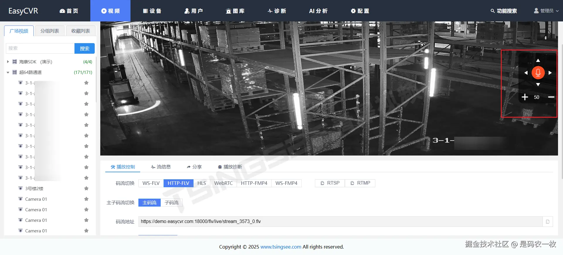 平台采用先进的流媒体处理技术,支持多码流自适应传输,支持多种视频流分发格式,包括RTMP、RTSP、HTTP-FLV、WebSocket-FLV、HLS、WebRTC、WS-FMP4、HTTP-FMP4等,使得管理者可以通过多种终端查看监控画面。