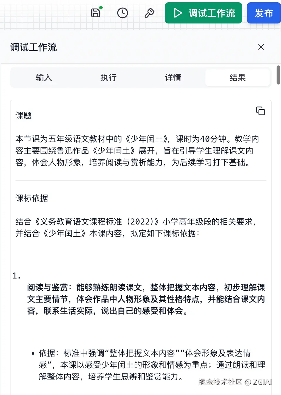 调试完,所有节点都执行成功之后,在结果页可以看到最终输出。一篇完整且专业的《少年闰土》的教案就完成了。