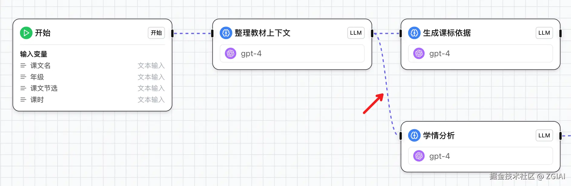 - 因为学情分析节点不依赖 节点2 和 节点3 的输出,因此我们可以让这些节点并列,提高点运行速度。