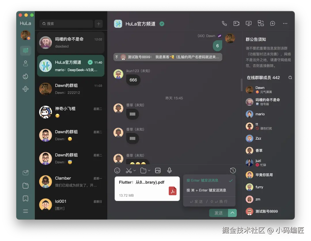 从实际使用来看,HuLa 的表现令人满意。启动速度快,界面响应灵敏,消息收发几乎无延迟。多窗口切换流畅,系统通知及时,文件传输稳定。尤其是在低配置设备上,相比其他大型聊天软件,它的轻量化优势尤为明显。