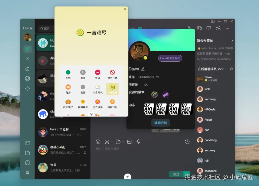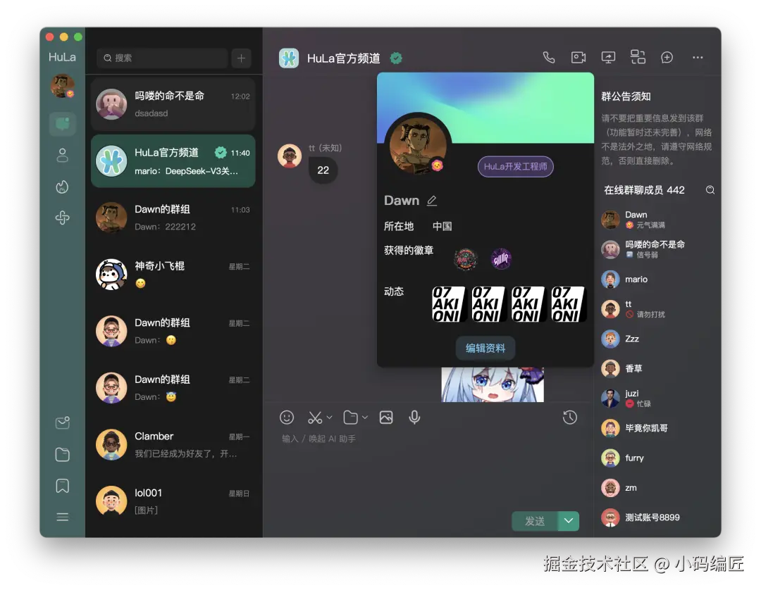 另外,HuLa 还集成了实用的系统功能,如多窗口管理、系统托盘通知、图片查看器、截图工具(开发中)以及基于七牛云的文件上传服务。未来还将支持 AI 聊天助手,进一步提升交互智能性。