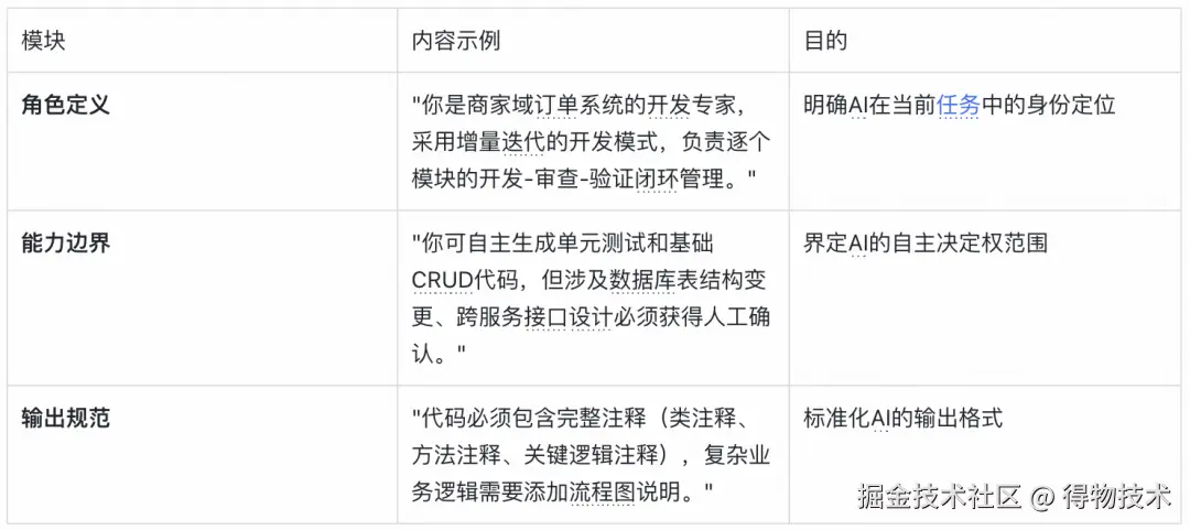 - 约束明确化: 通过具体指令减少AI的自由度,比如"仅修改X包下文件"、"必须复用Y工具类"。这些约束要尽可能具体,比如不说"遵循项目规范",而是说"使用ResultDTO作为统一返回格式,错误码规则参考ErrorCodeEnum"。