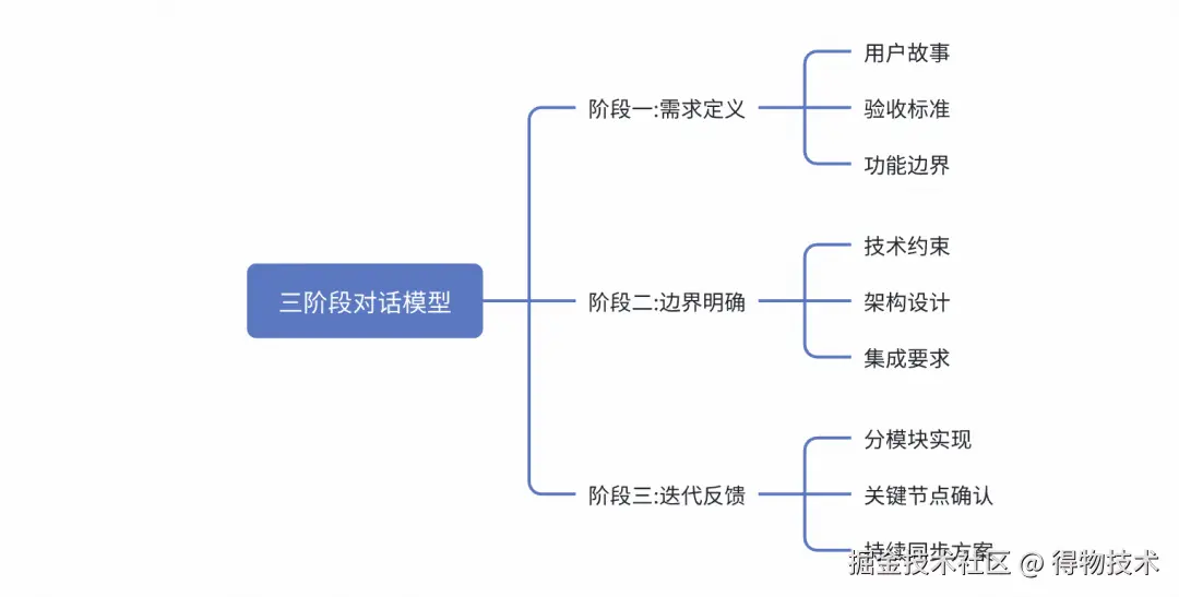 - 增量式提问: 采用"先框架后细节"的提问策略,先让AI生成接口定义和整体框架,待确认后再逐步深入实现细节。这种方式很像我们带新人时"先搭骨架再填肉"的指导方法。