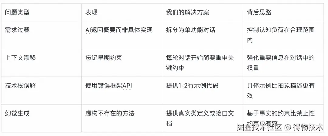 - 错误模式学习: 记录AI常犯的错误类型,针对性优化系统提示词。我们有一个"AI错误案例库",记录了"AI忘记处理分布式锁超时"、"日期格式转换错误"等典型问题及解决方案。