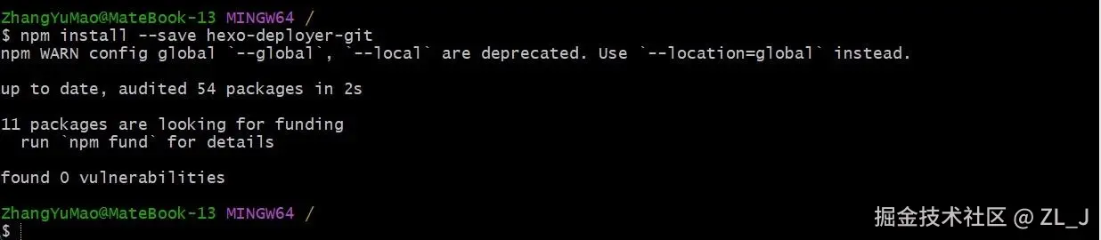 打开git-bash输入安装命令:npm install --save hexo-deployer-git