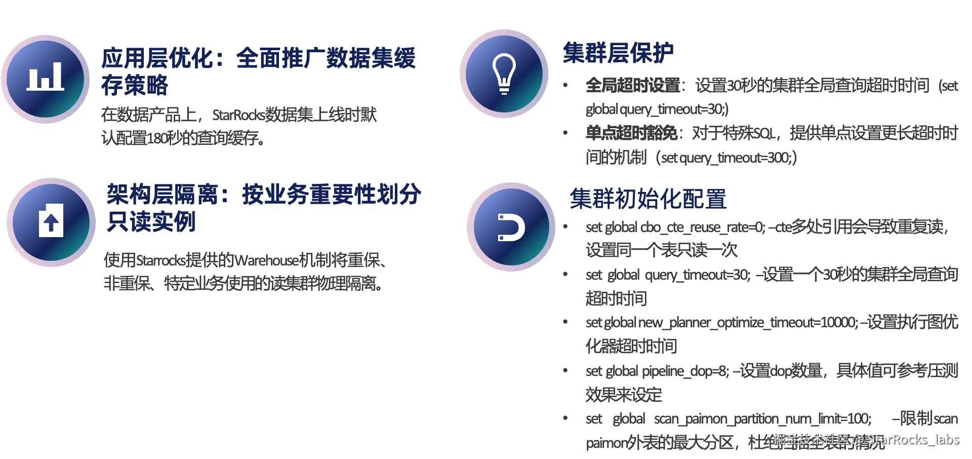 2)集群层面的保护机制: 集群侧设置了 30 秒的全局超时:如果一条 SQL 在 30 秒内仍未执行完成,会被自动终止。该机制属于 StarRocks 的集群保护能力,当查询执行时间超过 30 秒,即可判定该 SQL 需要进一步优化,不适合直接上线,需要回退并完成优化后再进入生产环境。对于少量确有必要、且在 30 秒内无法完成的特殊 SQL,也支持为单条 SQL 配置更长的超时时间。但此类 SQL 数量通常极少,上线评估也会更加严格,以确保不会对整体集群稳定性产生影响。整体目标是避免单条慢 SQL 拖垮集群。