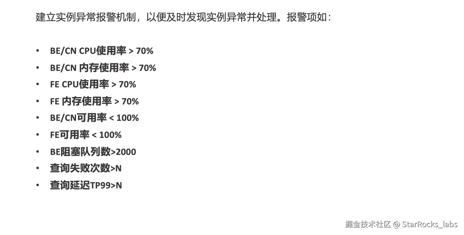 建立 StarRocks 实例的异常报警机制非常关键,它能够帮助及时发现实例异常并快速介入处理。报警项的设置通常围绕“资源水位、节点可用性、调度拥塞、查询失败与时延”几类核心信号展开,其中有一部分阈值来自大促压测与实战探索,具有较强参考价值: