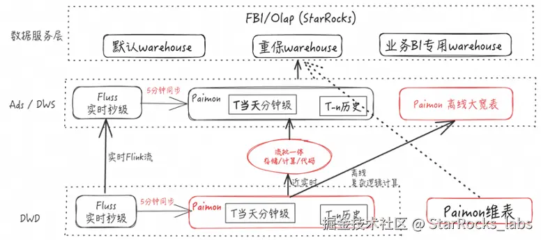 - 架构上实现存储介质的统一:将实时与离线数据统一沉淀到 Paimon 的湖存储中。在此基础上,StarRocks 可以直接面向湖存储进行高性能分析查询,从而能够消除数据同步链路以及多份存储带来的成本。