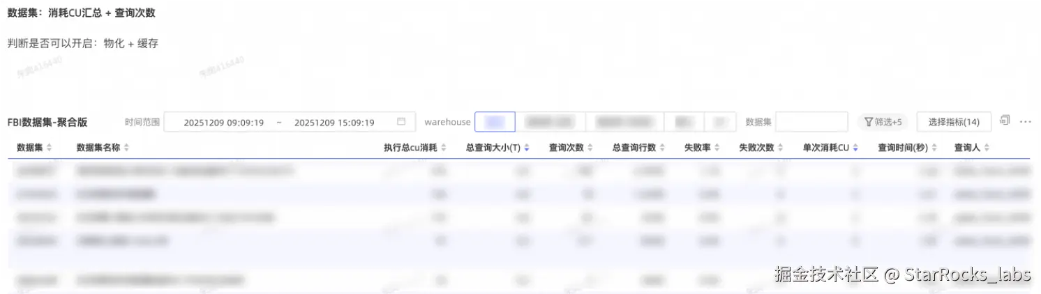 在监控大盘的组织方式上,支持按 Warehouse 维度拆分(例如划分为多个 Warehouse),同时也可以按数据集进行过滤。在筛选完成后,重点关注的数据字段通常包括:数据集名称、总 CPU 消耗、总查询大小、查询次数、查询行数、失败率与失败次数、单次查询的 CU 消耗、查询时间以及查询发起人等。这些指标支持排序与聚合,便于在优化过程中选取特定时间窗口,对总 CPU 消耗、总查询大小、总查询行数等维度进行 Top SQL 排查与治理。通过优先治理这些“高消耗/高影响”的 SQL,往往能够显著改善集群整体健康状况,因为在许多情况下,集群不稳定的根因来自少量高风险的“坏 SQL”。
