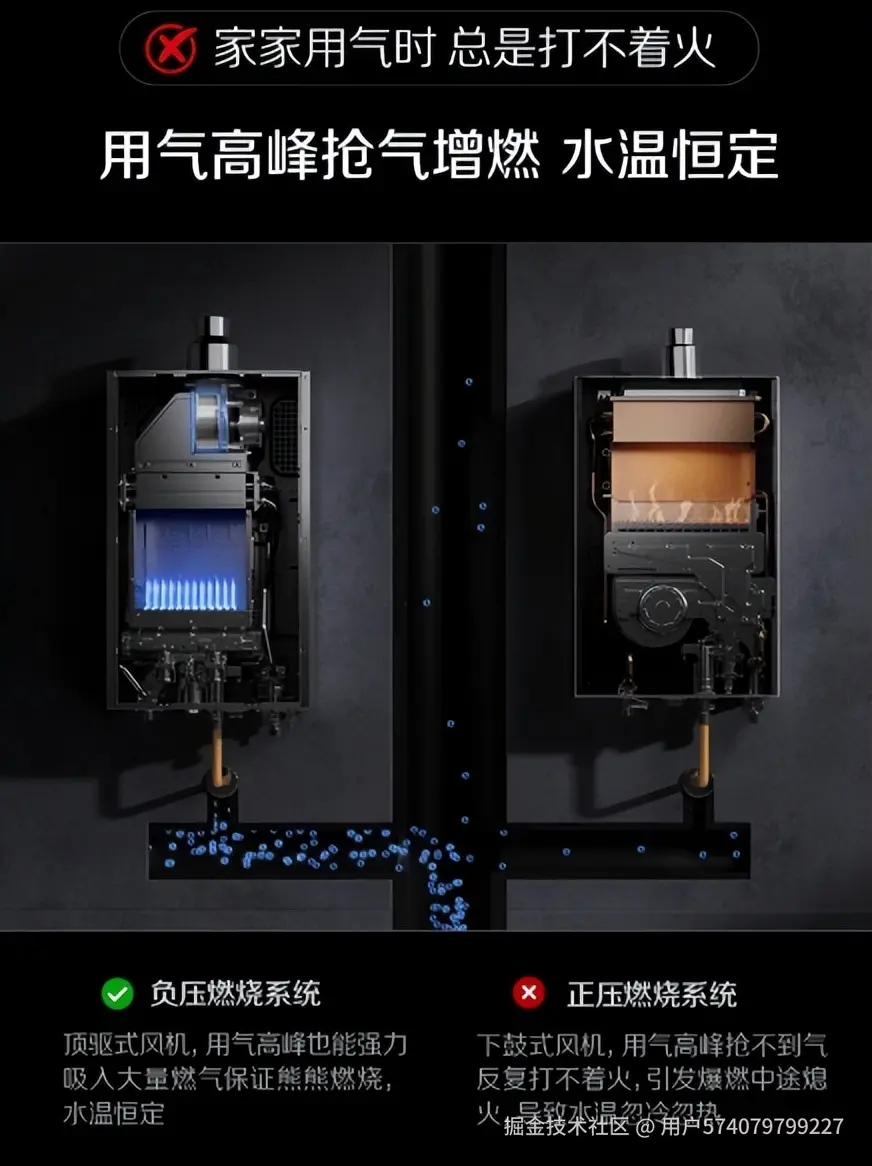 ● 核心特点:采用“磁悬浮燃气比例阀”与“双温度传感器”组合,水温波动控制出色。下置风机结构有助于燃烧效率与抗风能力。