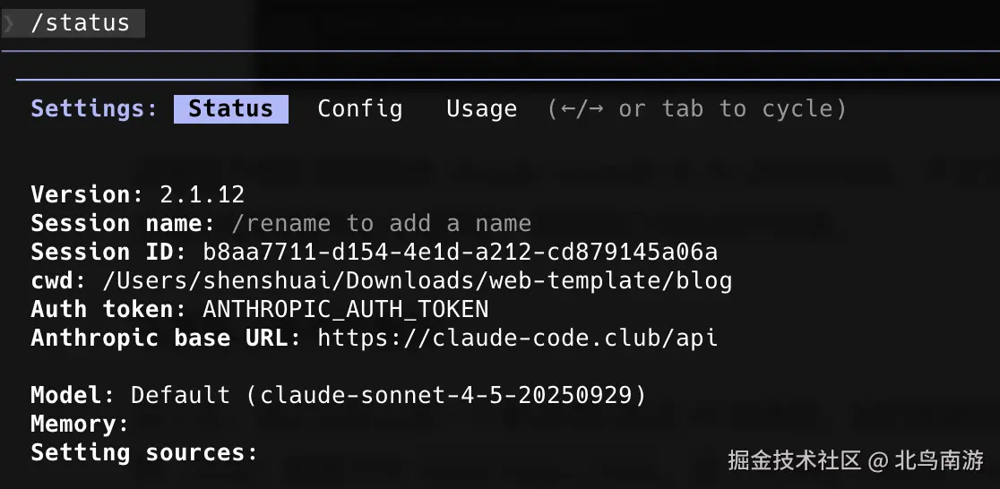 保存并关闭 settings.json 文件。我们重新运行 Claude Code 并通过 /status 命令查看当前模型信息: