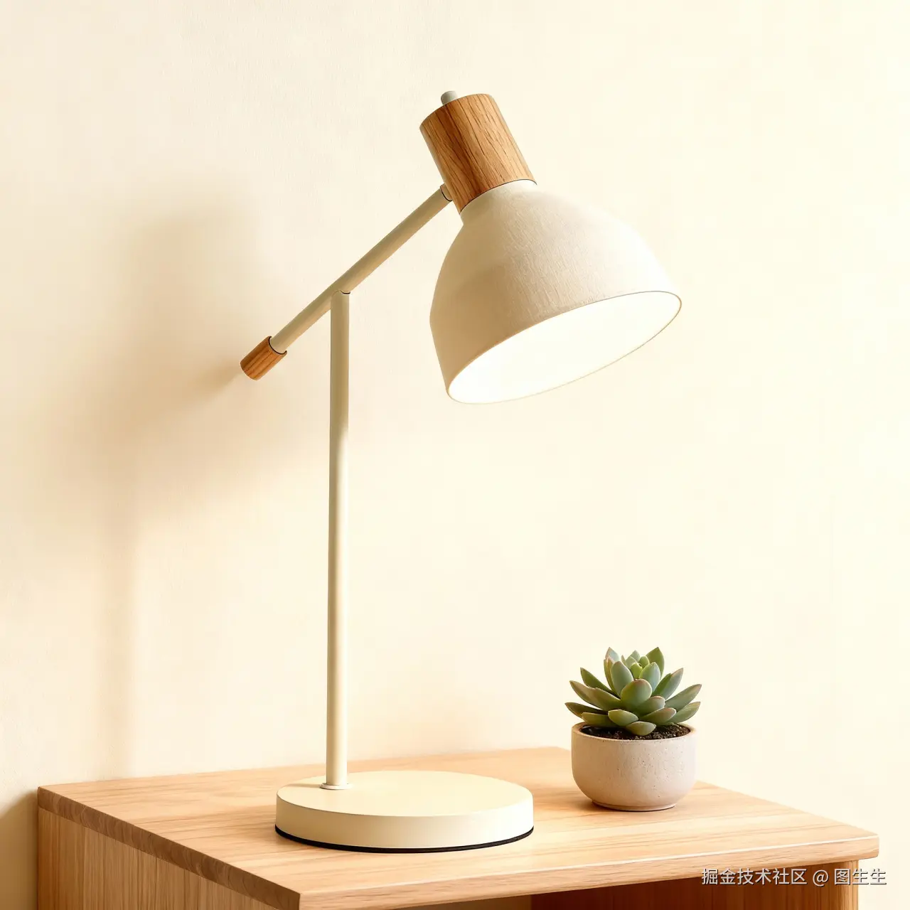 ▶AI指令: 背景为浅奶油色墙面,台灯摆放在浅原木色边几上,旁置一盆小型多肉盆栽,呈现清爽北欧客厅角落。