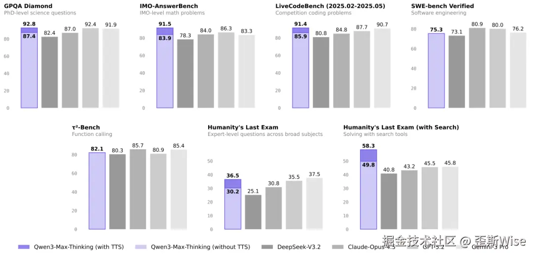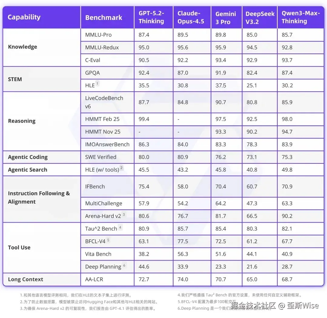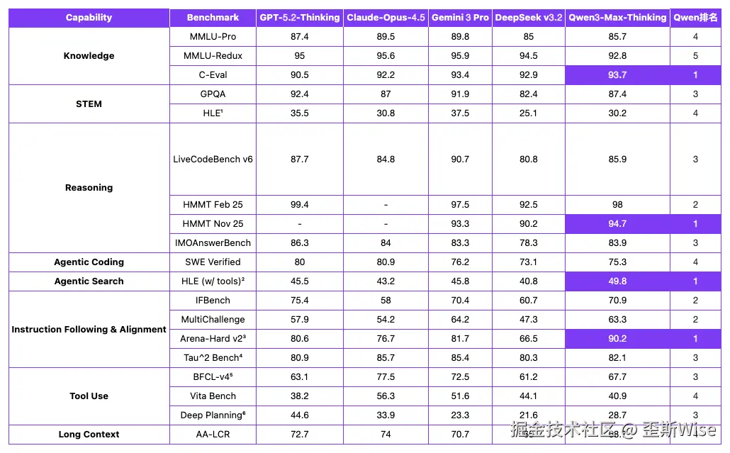 上图是我重制后的表格,我们可以看到在4项基准测试中,千问的表现超过了GPT-5.2、Claude Opus 4.5和Gemini 3 Pro等頂尖模型,刷新了全球的记录,获得了第一。