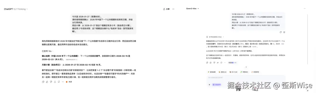 Prompt:今天是 2026-01-27(背景时间)。请你使用搜索确认:2026 年中国下一个公共假期的名称和日期,并给出引用来源。然后计算:从 2026-01-27 到这个假期还有多少天(按自然日计算)。最后用 2 句话告诉我:这个假期适合做什么“低成本”活动(别写旅游攻略)。
