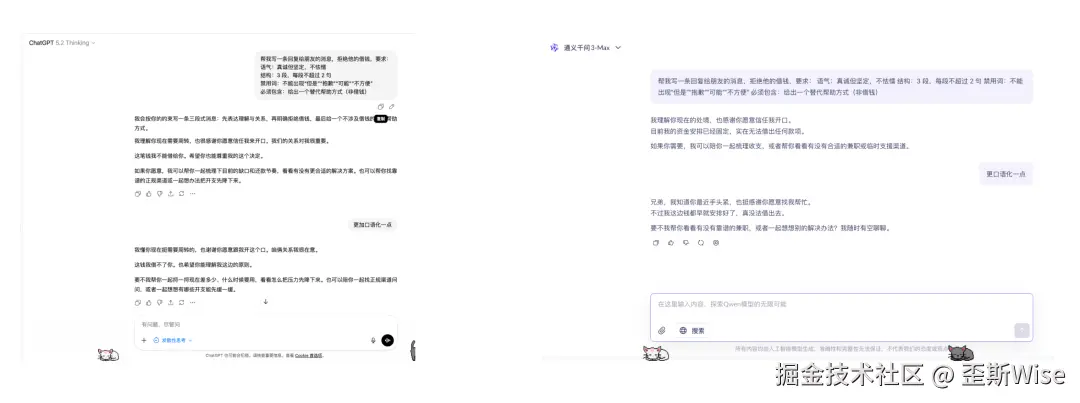 联网搜索和数据计算部分,二者表现相当,但GPT在怎么低成本过春节的部分,是让我去合照和年夜饭火锅,Qwen会更贴合中文语境,包饺子、贴春联还有视频拜年。